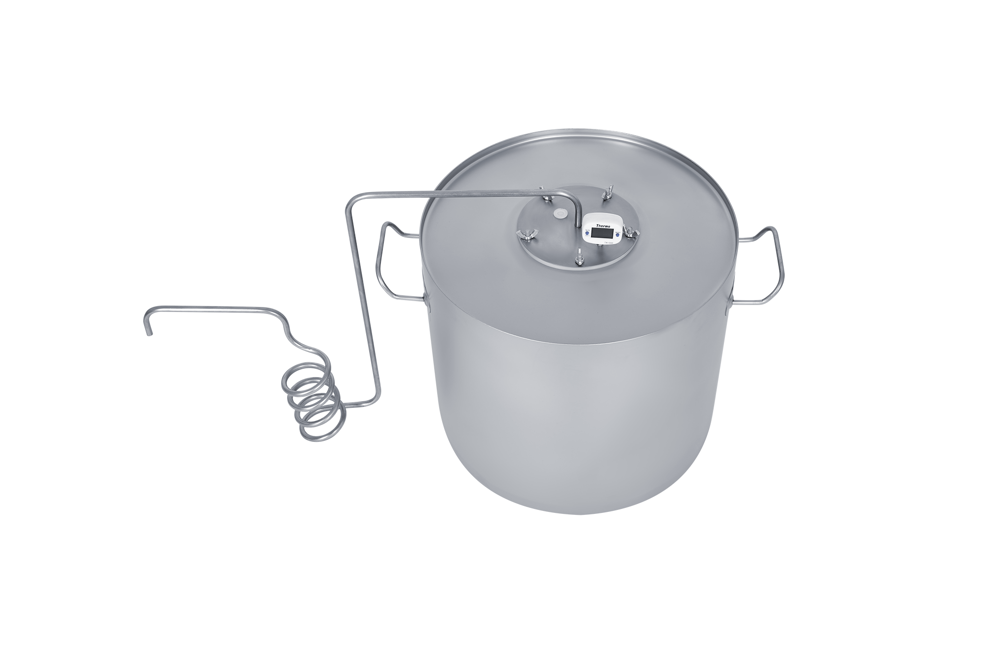 Перегонный куб имеет ёмкость 12 литров и плоское, усиленное дно из пищевой стали AISI 430, которое совместимо со всеми типами плит, включая индукционные. Аппарат оснащён удобными ручками, благодаря которым его можно безопасно и легко перемещать.